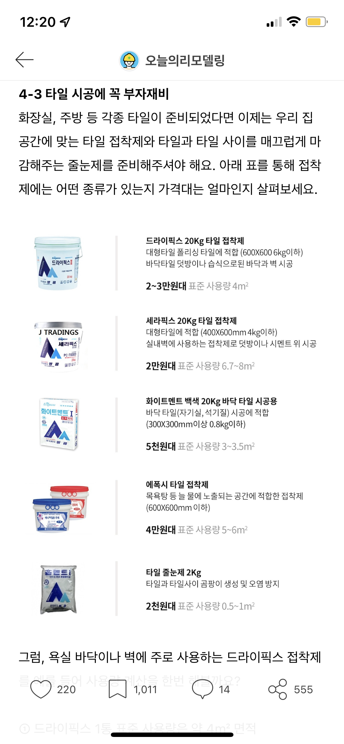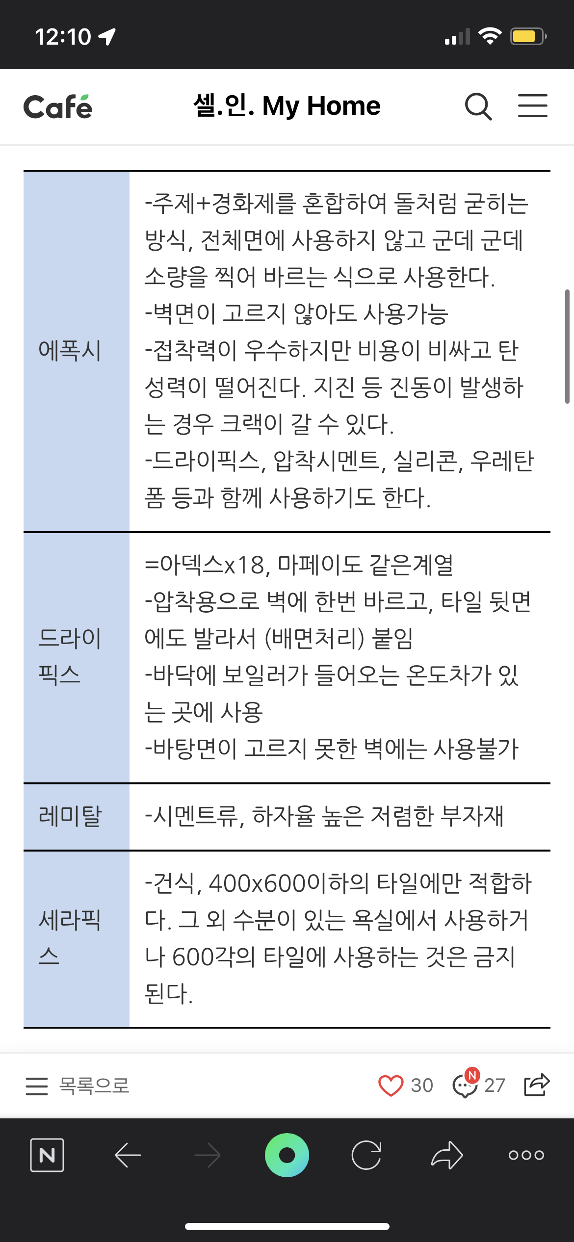 현관이나 거실 바닥면을 시공할 때는 드라이픽스 보다는 타일 접착제 중 값이 저렴한 화이트멘트도 괜찮음